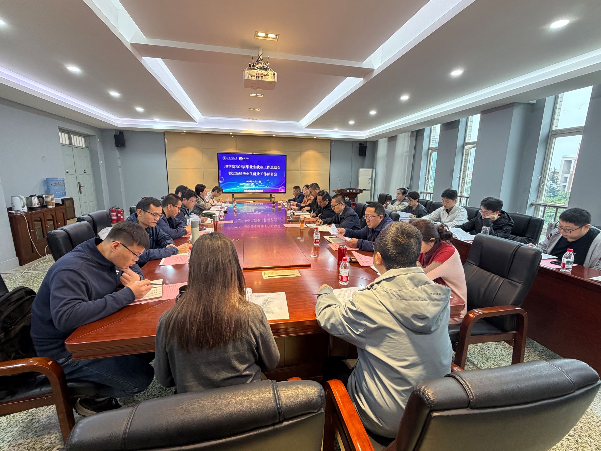 10月11日,理学院召开2025届毕业生就业工作总结暨2026届就业工作部署会。学院领导班子成员、两办主任、学科主任、专业负责人及学生党支部书记等参加会议。会议还特别邀请学校招生就业处处长付刚、副处长刘畅莅临指导。会议由理学院党委副书记刘玉森主持。