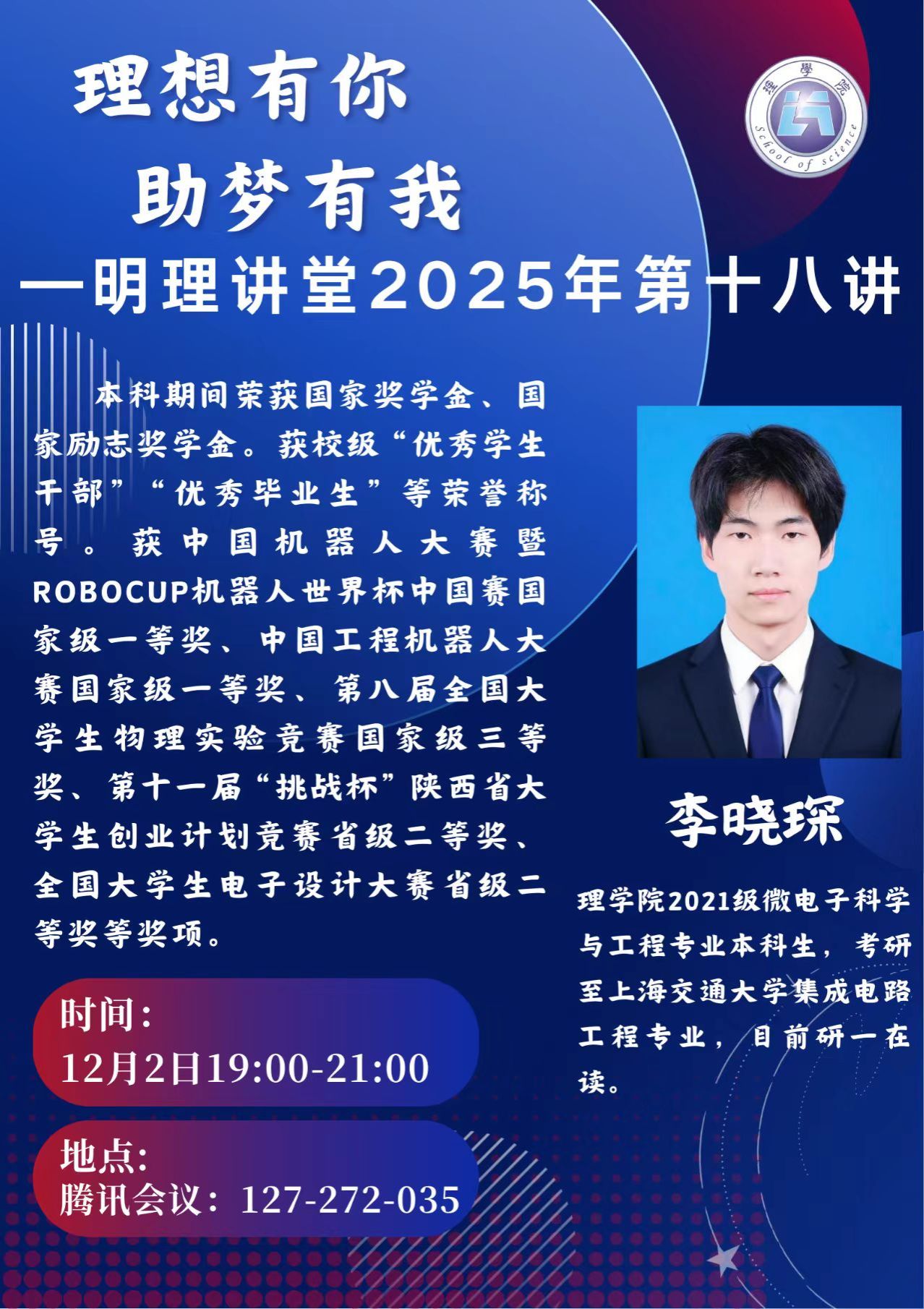 12月2日晚,理学院在临潼校区B137教室举办“明理讲堂”第十七、十八讲。活动由2025级辅导员宋晓盼主持,2022级信息与计算科学专业本科生刘子燊、2025届微电子科学与工程专业校友李晓琛主讲,2025级全体本科生参加。