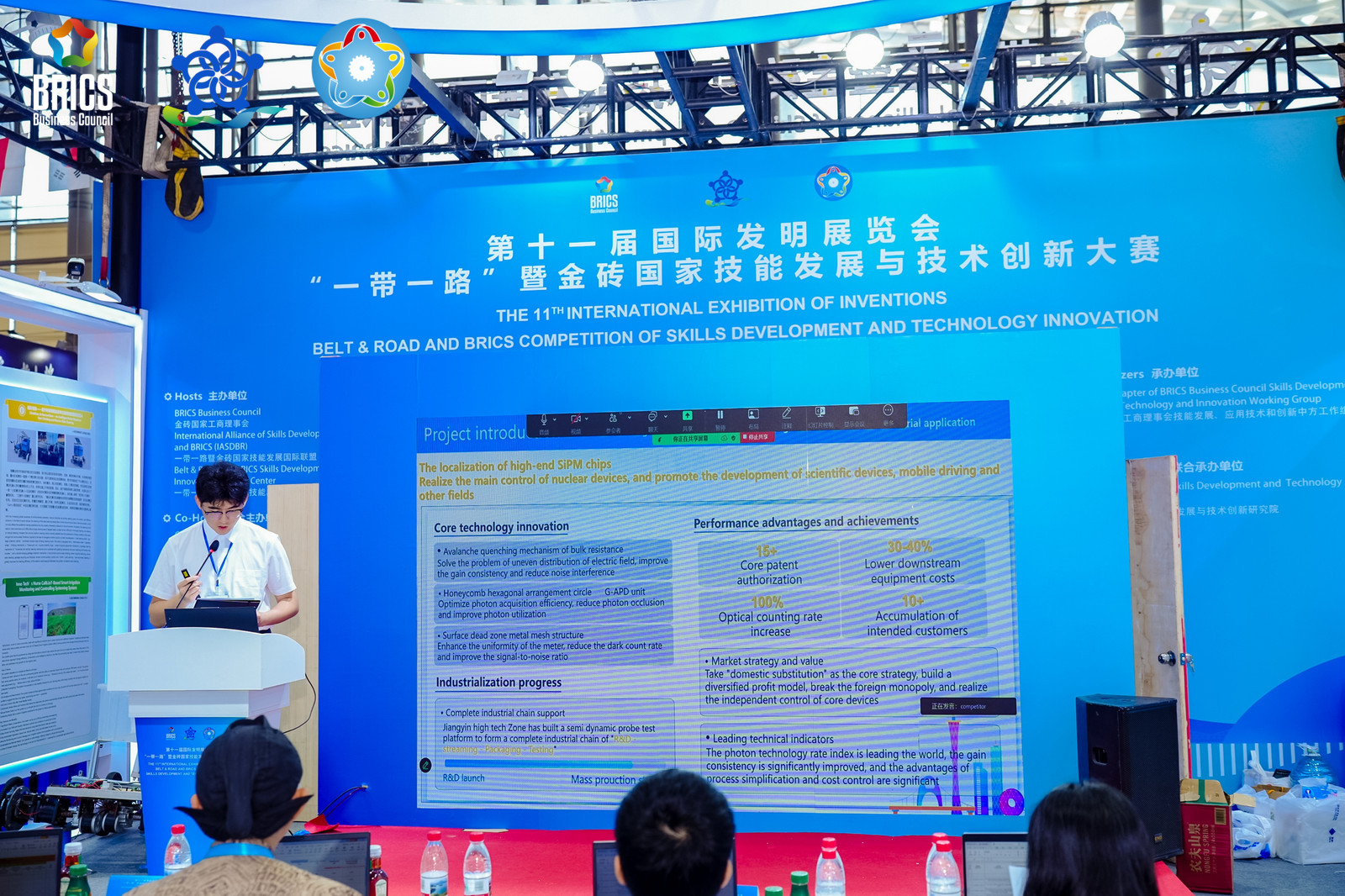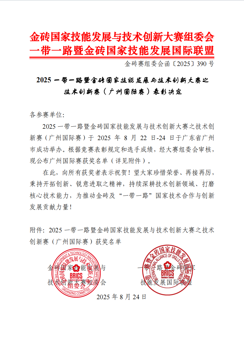 此次大赛由金砖国家工商理事会中方理事会与“一带一路” 暨金砖国家技能发展国际联盟联合主办,与第33届广州博览会同期举办,规格高、覆盖广、影响力深。大赛聚焦先进制造、数字医疗、绿色能源等七大前沿领域,吸引32个国家1400余件作品参赛,经多轮严苛筛选仅 128 件作品晋级决赛,决赛采用 “路演—答辩—展览”三位一体模式,且全程要求全英文表达,评审标准兼顾技术前瞻性、实施可行性及对“一带一路”暨金砖国家的社会价值,竞争异常激烈。