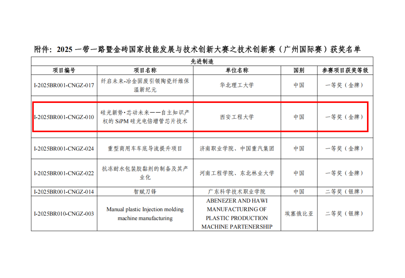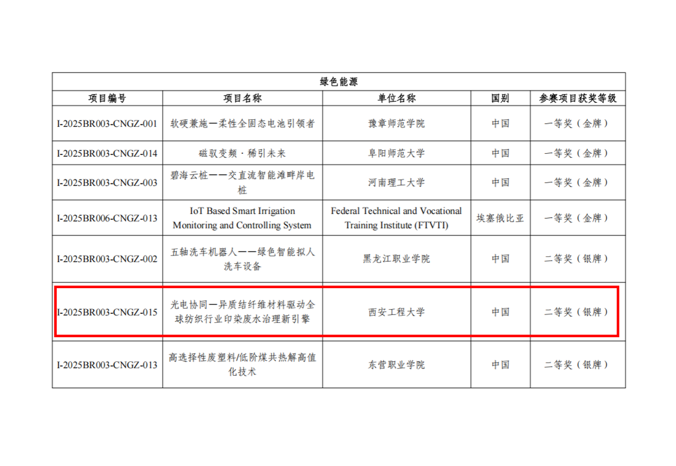 学校高度重视此次大赛,提供了全方位的支持和保障。理学院精心组织、积极备赛,组建专业指导团队与参赛队伍,由张国青、卢定泽、曹得重三位老师全程提供技术指导。团队分工协作、协同攻坚,确保项目从技术打磨到展示呈现均达到国际赛事标准。在先进制造赛道,“硅光新势・芯动未来——自主知识产权的SiPM硅光电倍增管芯片技术”项目团队,通过芯片核心技术拆解演示、性能测试数据可视化呈现及专利成果展示,系统阐述项目在SiPM芯片领域的三大突破,即实现核心专利自主化以打破国外技术垄断、将光子探测效率提升30%-40%使关键技术指标达国际先进水平、降低下游设备应用成本为“一带一路”沿线国家先进制造产业升级提供高性价比芯片解决方案,答辩环节中团队从容应对专家提问,凭扎实技术功底与清晰逻辑表达获高度认可,最终斩获一等奖(金牌);在绿色能源赛道,“光电协同—异质结纤维材料驱动全球纺织行业印染废水治理新引擎”项目团队,通过异质结纤维材料实物展示、废水处理模拟实验视频及10+意向客户合作意向书呈现,直观展现项目利用光电协同技术实现印染废水100% 达标排放、材料可循环利用降低治理成本、适配中小型纺织企业需求的优势,为“一带一路” 沿线纺织产业集中地区提供绿色环保废水治理方案,获评审专家“将绿色材料技术与纺织行业痛点深度结合,为全球纺织业绿色转型提供可复制中国方案”的高度评价,最终斩获二等奖(银牌)。