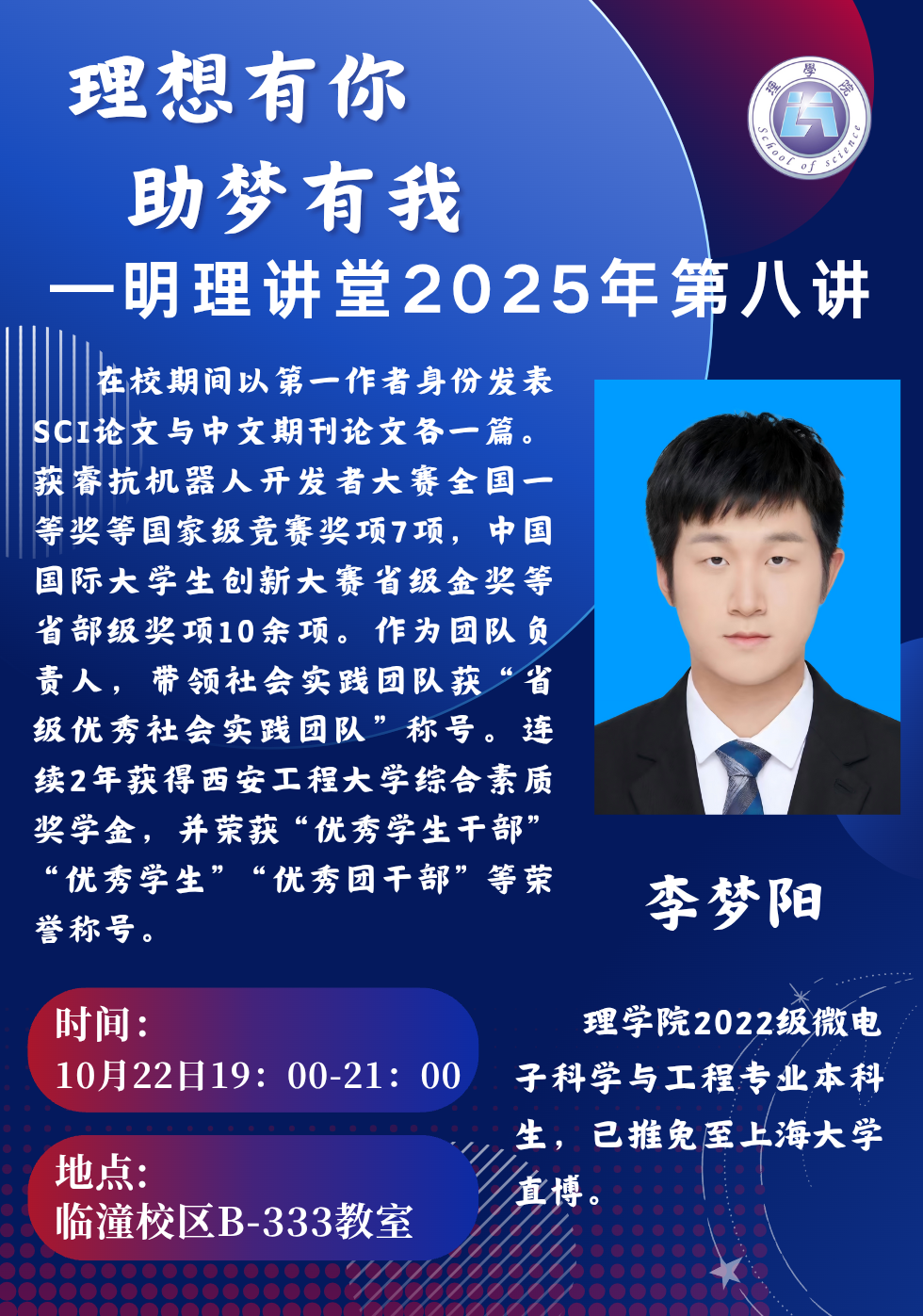 10月22日晚,理学院在临潼校区B333教室举办理想有你,助梦有“我”之明理讲堂2025年第八讲。本次活动由2022级微电子科学与工程专业本科生李梦阳担任主讲,他以“敢闯会创:青春的知行合一”为主题,围绕学科竞赛与社会实践,与2025级全体本科生进行经验交流。本次活动由辅导员宋晓盼主持,辅导员张澜一同出席。