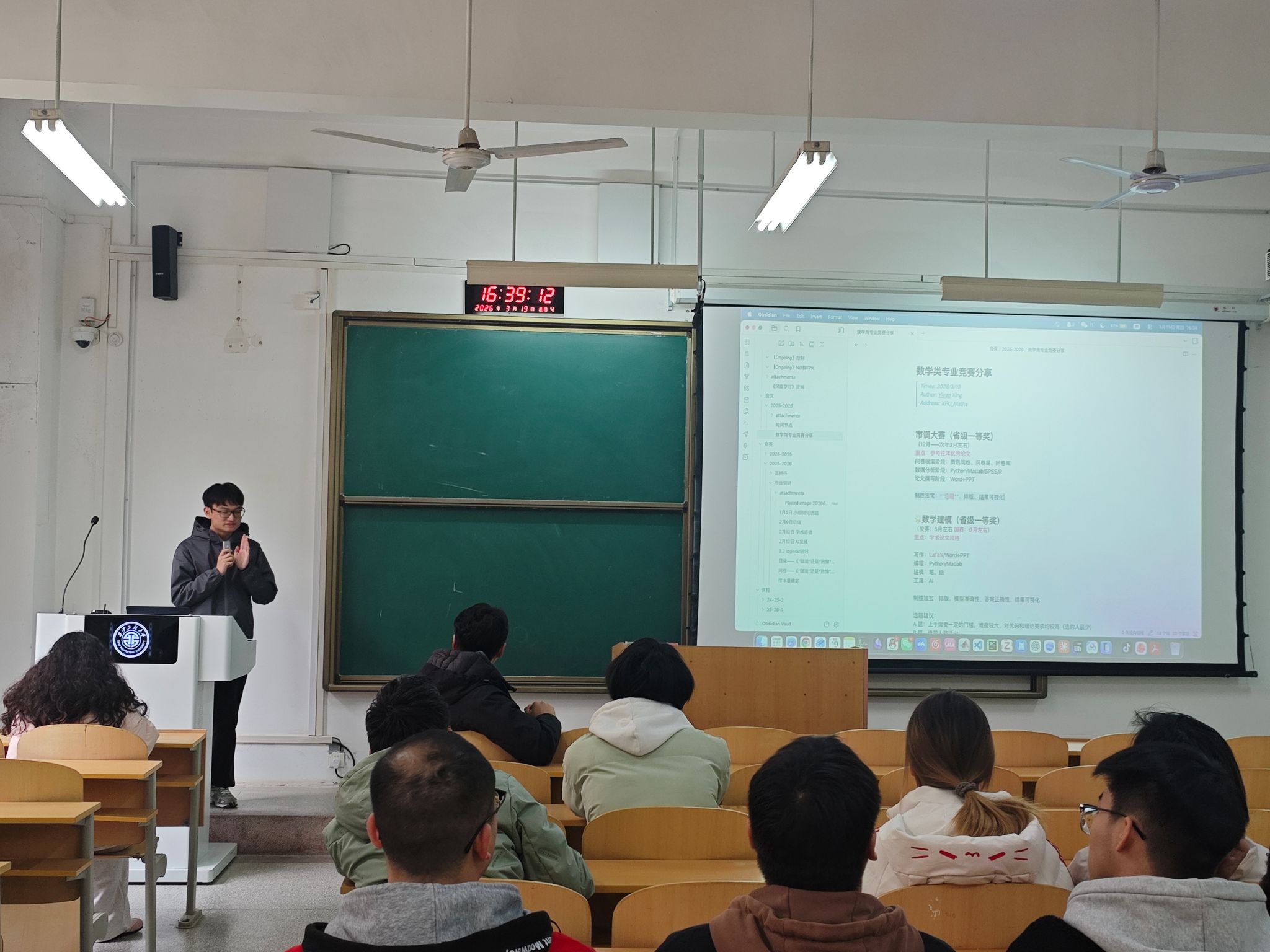 在数学类专业讲座中,邢艺耀同学聚焦市场调研大赛与数学建模竞赛,详细梳理了这两类赛事的时间安排、常用工具以及备赛重点。重点就选题角度做了指导,希望同学们在选题中要主动契合国家战略导向,关注“十五五”规划、全国两会等时代热点,并对问卷收集、数据分析、论文汇报等关键阶段进行了深入讲解。向琪琪同学们则分享了全国大学生统计建模和数学竞赛的参赛心得,围绕赛程节点、组队分工、论文框架以及备考阶段给出了具有实操性的建议,还就材料提交、查重等事项做了提示,鼓励同学们在竞赛中收获成长。