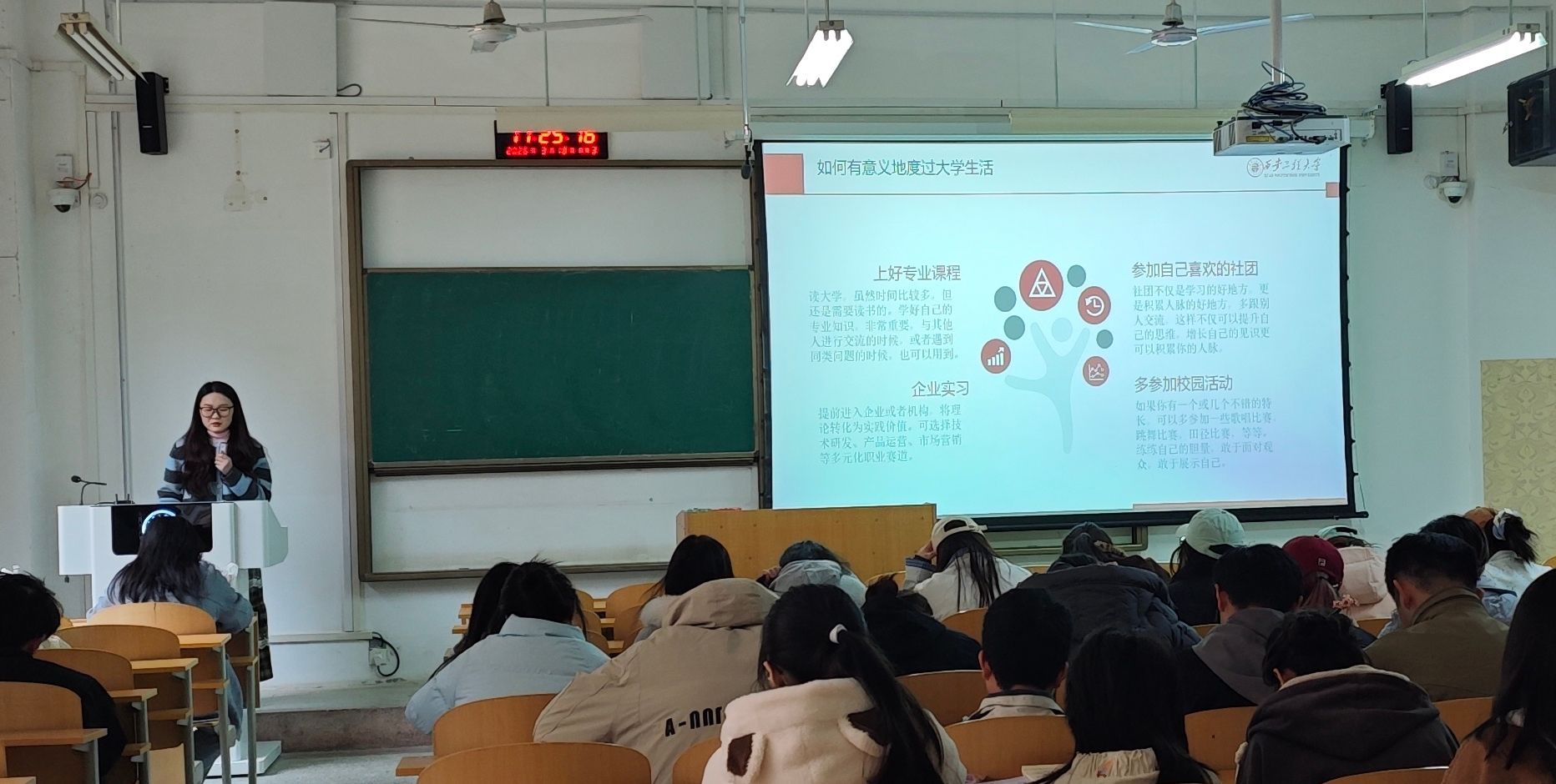在统计学、金融学专业讲座中,侯雅婷同学们首先对高效学习以及提升平均学分绩点(GPA)的实用方法进行了系统拆解,然后结合自身政务实习、“三下乡”活动、志愿服务等经历,阐述了社会实践对于个人成长的重要价值,着重强调了竞赛在以赛促学、衔接理论与实践过程中的关键作用;刘悦同学则结合自身多次获奖经历,系统介绍了高教社杯数学建模竞赛、统计建模竞赛以及市场调查与分析大赛这三项重要赛事,从组队、选题、备赛直至答辩的全流程分享了宝贵经验,鼓励同学们勇于尝试,将竞赛作为提升综合能力的重要途径。