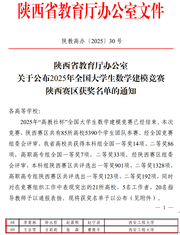 近日,2025年全国大学生数学建模竞赛陕西赛区获奖名单正式公布,我校学子凭借扎实的数理功底、卓越的团队协作与创新实践能力脱颖而出,斩获国家级二等奖2项,省级一等奖11项、二等奖32项,获奖数量创历史新高。理学院杨海教授获评陕西赛区优秀指导教师。全国大学生数学建模竞赛作为首批入选“全国普通高校大学生竞赛排行榜”的核心赛事,由教育部高等教育司与中国工业与应用数学学会联合主办,是检验高校人才培养质量与学生综合...